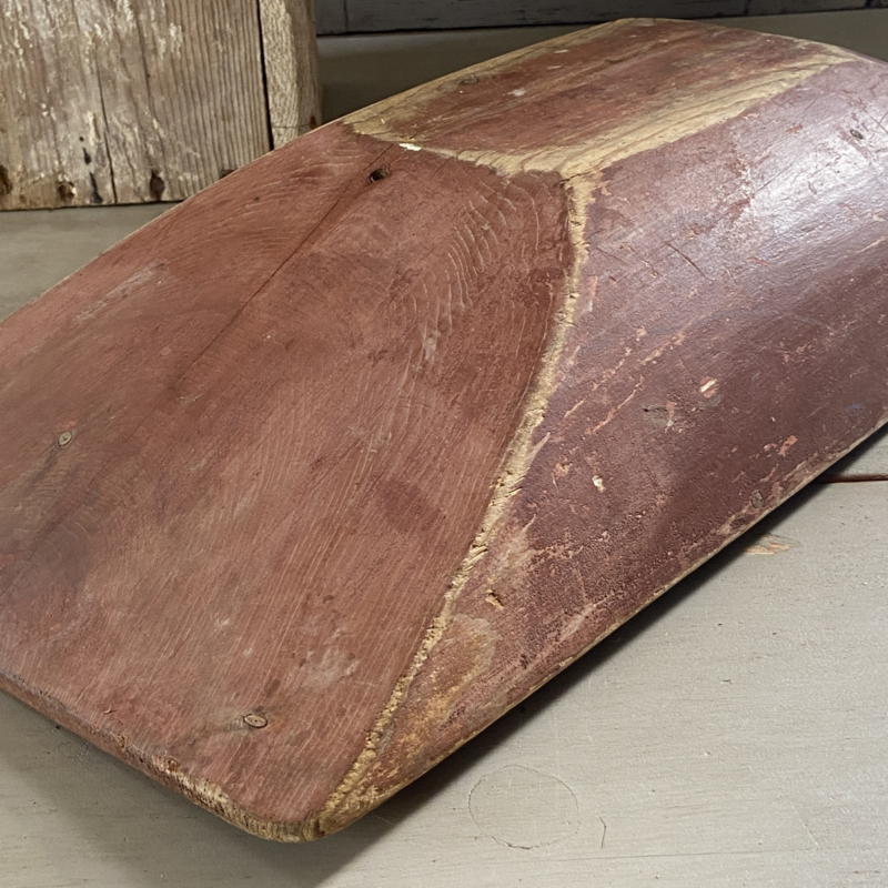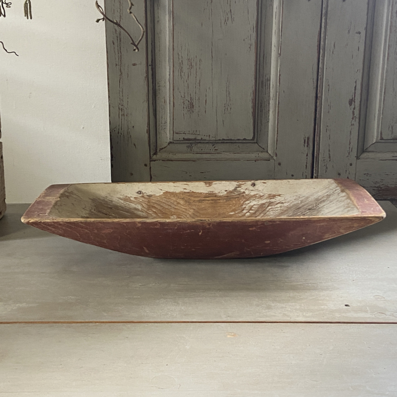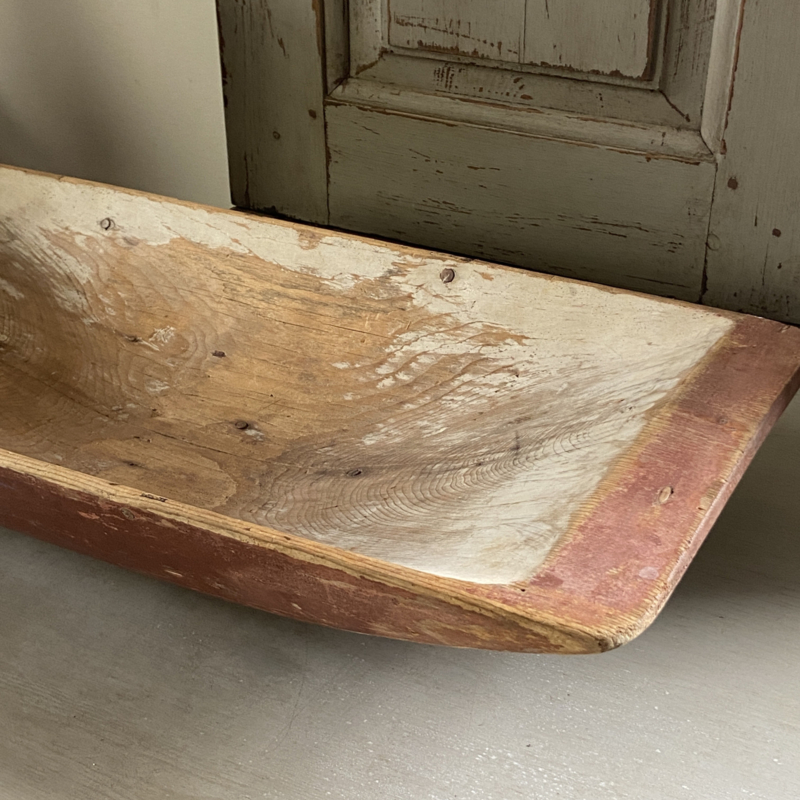 Deze authentieke handgesneden Zweedse trog met de originele rode verf is echt een verzamelaarsstuk. Die kleur rood, vaak Falu Rödfärg genoemd, is iconisch. Het is van oorsprong een bijproduct van de kopermijnen in Falun en werd vroeger gebruikt om de houten huizen het aanzien van baksteen te geven (een teken van rijkdom)